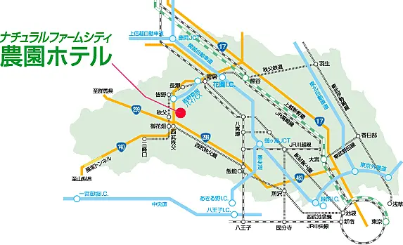 圏央道経由 狭山・日高IC→(R299 を秩父方面へ) →農園ホテル(狭山・日高ICより約60分)