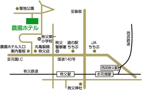 関越自動車道経由 花園IC→(R140 を秩父・長瀞方面へ) →長瀞町→農園ホテル (花園ICより皆野寄居バイパス経由約40分)